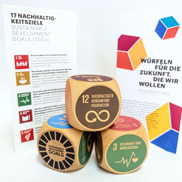 Das Würfelspiel dient der Sensibilisierung für die Themen und Zusammenhänge der SDGs. Es schafft einen Einstieg zu den Inhalten der globalen Nachhaltigkeitsziele und macht Lust auf mehr Auseinandersetzung dazu. Es gibt drei Würfel mit insgesamt 18 Würfelseiten. Jede Würfelseite ist mit einem der 17 SDG bedruckt, eine der 18 Würfelseiten entspricht einem Joker. Gewürfelt werden drei Würfel gleichzeitig oder jeweils einzeln - dann kann sich die Spielrunde anhand von Fragen oder Aktionen die gewürfelten Ziele genau anschauen und in Austausch treten. Das Würfelspiel ist flexibel einsetzbar. In der Anleitung werden verschiedene Varianten vorgestellt, die je nach Bedarf angepasst werden können. Beigelegt ist auch eine Übersicht zur Erläuterung der SDGs.